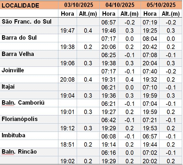 Recomenda-se atenção para os horários da Tabela 1 nos locais próximos a desembocaduras de rios, pois a maré seca dificulta a entrada e saída de embarcações, podendo resultar em encalhes.