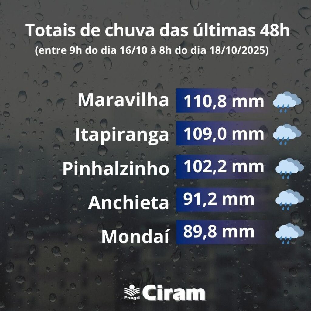 Tabela 1 – Precipitação acumulada em SC, em 48 horas, entre 09h do dia 20 e 08h do dia 18/10/2025. Fonte: estações monitoradas na rede Epagri/Ciram.