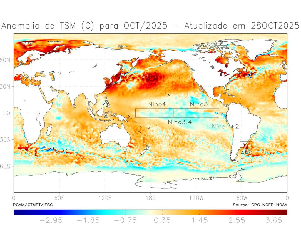 Figura 1 – Anomalia de TSM nos oceanos Atlântico e Pacifico em outubro de 2025. Fonte: IFSC.