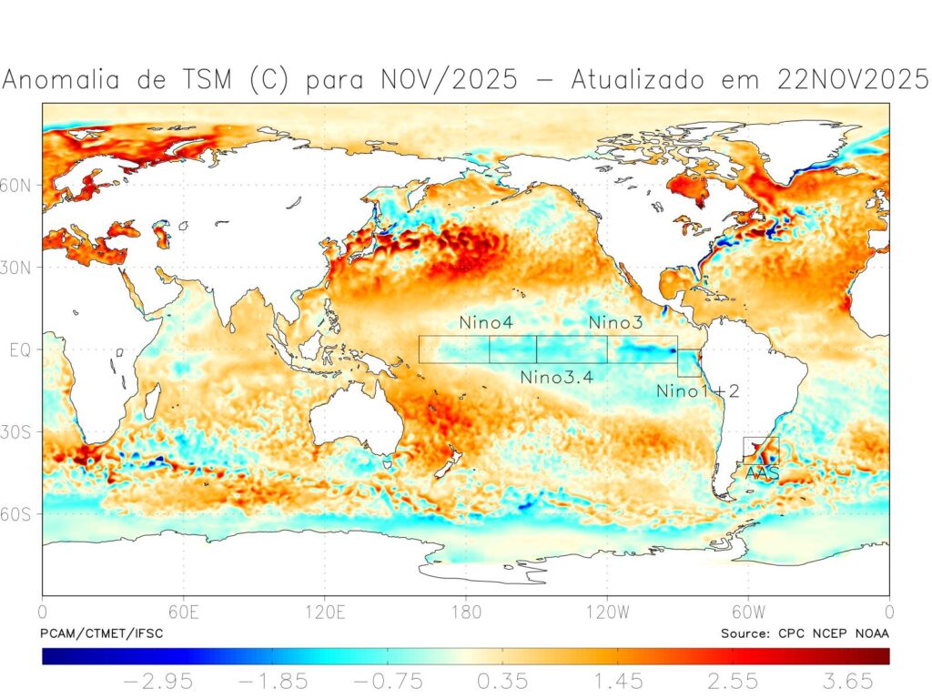 Figura 2 – Anomalia de TSM no Pacifico e Atlântico entre 01 e 22 de novembro de 2025. Fonte: IFSC.