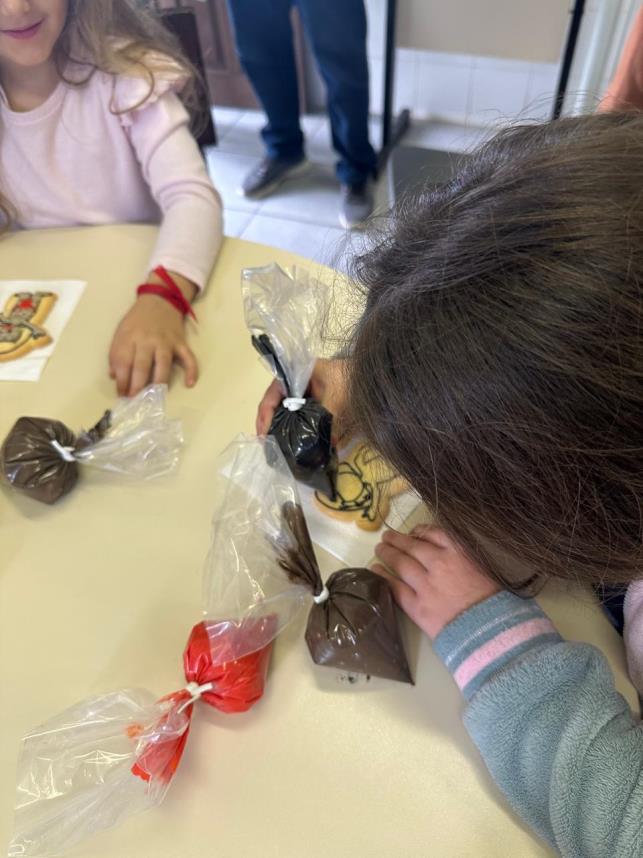 Após a narrativa, veio a parte mais aguardada: cada criança recebeu biscoitos moldados no formato dos personagens para decorar com glacê colorido. A pintura dos biscoitos estimulou criatividade, interação e curiosidade, criando um ambiente leve e divertido em que as crianças conversavam espontaneamente sobre os personagens.