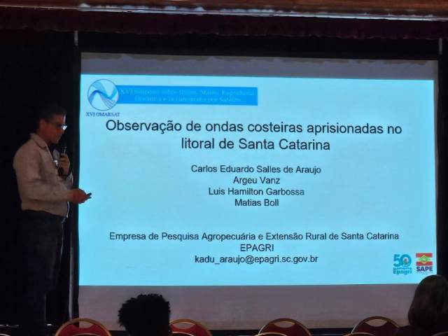 O pesquisador Carlos Eduardo Salles de Araújo da Epagri/Ciram apresentou o trabalho “Observação de ondas costeiras aprisionadas no litoral de Santa Catarina” no XVI Simpósio sobre Ondas, Marés, Engenharia Oceânica e Oceanografia por Satélite (OMARSAT), realizado em Cabo Frio entre os dias 24 e 28 de novembro de 2025.