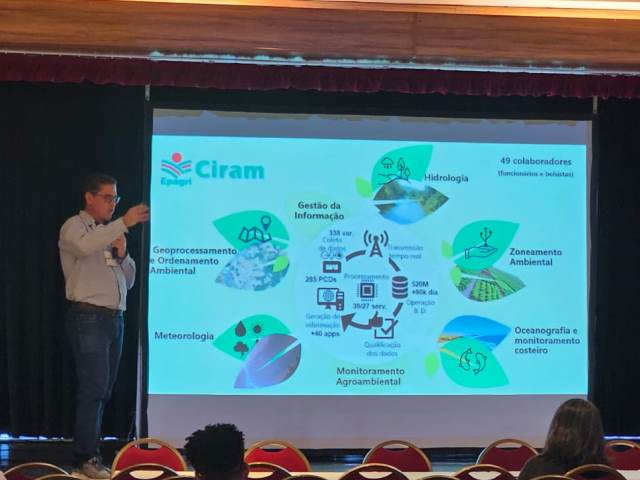 Na sua palestra, ministrada no auditório do evento no dia 27 de novembro de 2025, o pesquisador apresentou as atividades desenvolvidas e a infraestrutura do CIRAM, ressaltando o papel do setor de oceanografia e a importância do monitoramento costeiro para o estado de Santa Catarina.