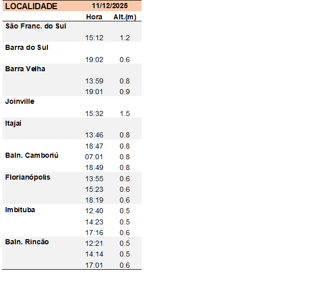 Os horários mais prováveis dos alagamentos (inundações costeiras) coincidirão com os picos de maré alta previstos na Tabela 1.