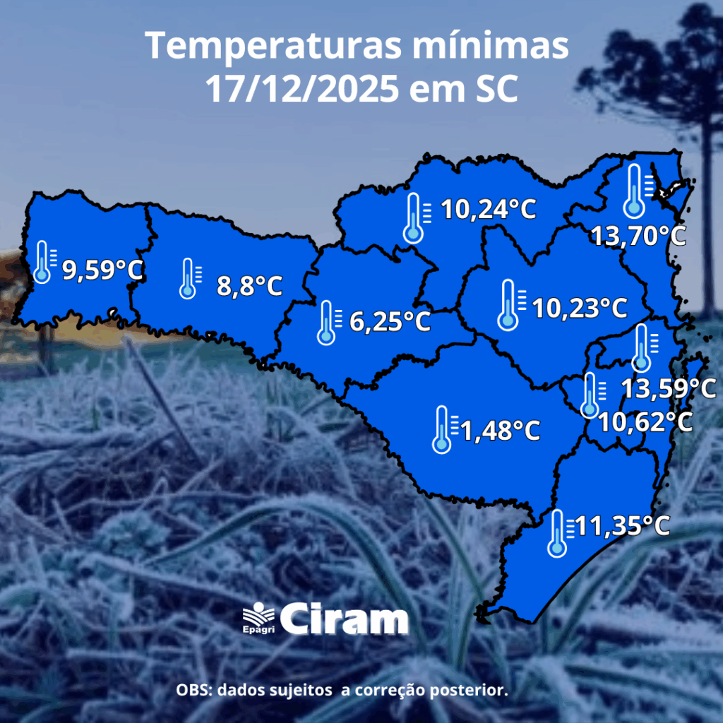 Figura 1 – Menores temperaturas mínimas registradas em SC, nas primeiras horas da manhã do dia 17/12/2025. Elaborado por: Maikon Alves – Técnico em Meteorologia – Epagri/Ciram.