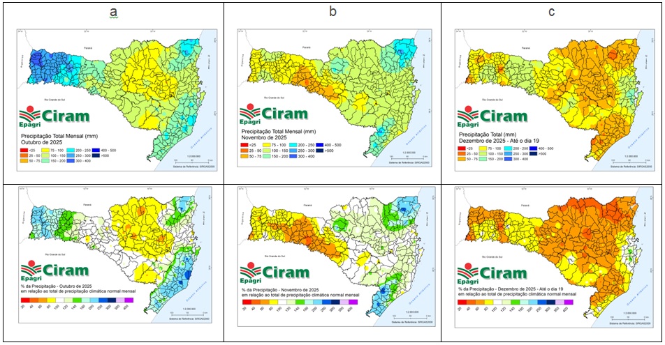 Figura 1– Mapas de precipitação total mensal e a porcentagem em relação à média mensal em SC nos meses de outubro (a), novembro (b) e dezembro até a manha de 19 (c), nas estações meteorológicas da Rede de Monitoramento de Dados da Epagri/Ciram. Elaborado por Maikon Passos.