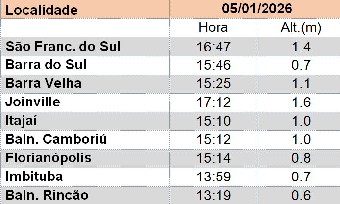 Os horários mais prováveis dos alagamentos (inundações costeiras) coincidirão com os picos de maré alta previstos na Tabela 1.