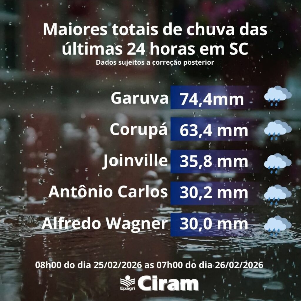 Figura 1- Maiores totais de chuva em 24h em SC 8h do dia 25/02 as 7h do dia 26/02/2026 .