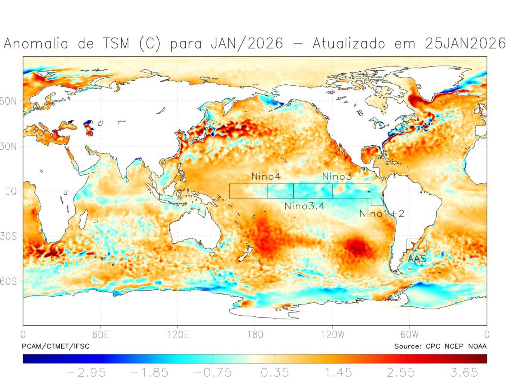 Figura 1 – Anomalia de TSM nos oceanos Atlântico e Pacifico, em janeiro de 2026. Fonte: IFSC.