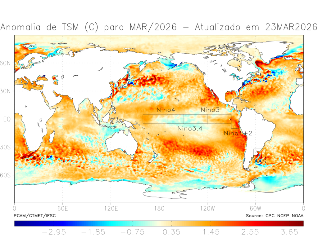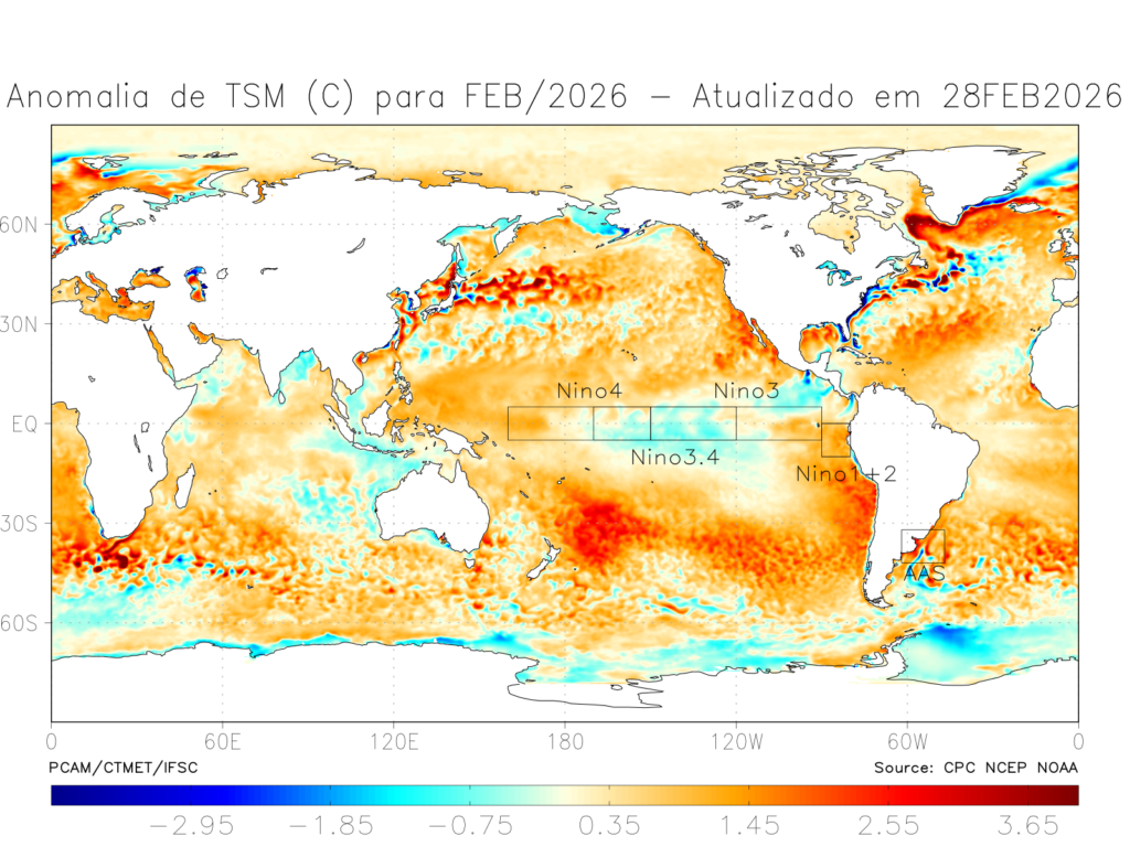 No mês de fevereiro de 2026 a área de monitoramento do fenômeno ENOS (El Niño-Oscilação Sul), no Pacífico Equatorial, permaneceu mais fria, com anomalias negativas de temperatura em torno de -0,5°C (Figura 1) apenas no Niño 3.4, indicando diminuição da condição associada ao fenômeno La Niña fraca. Em março, anomalia positiva de 0,3°C a 1,4°C foi observada no restante das áreas de monitoramento do ENOS no Pacífico Equatorial (Figura 2), indicando uma evolução para a fase de Neutralidade do fenômeno, que permaneceu nesta condição na maior parte do mês.