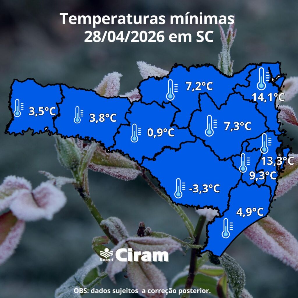 Figura 1 – Temperaturas mínimas em SC, no dia 28/04/2026.
