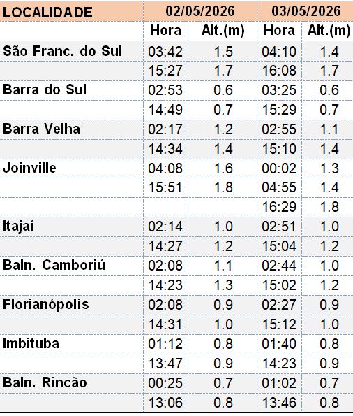 Tabela 1 – Maré astronômica prevista pela Epagri.