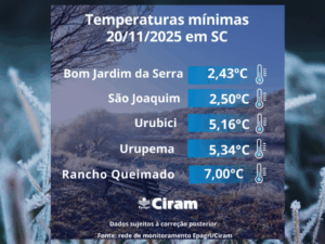 O amanhecer desta quinta-feira (20) foi gelado nas áreas altas do Planalto Sul de SC, com temperatura de 2°C a 5°C e registro de geada em São Joaquim e Bom Jardim da Serra. Em Rancho Queimado, Florianópolis Serrana, a temperatura mínima foi de 7°C (Figura 1). Essa condição está associada a uma massa de ar…