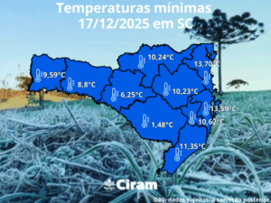 O registro de geada em Santa Catarina, durante o mês de dezembro é um evento de baixa frequência e atípico para época do ano, e foi registrado no amanhecer da quinta-feira (04/12/25) em São Joaquim. Desde 1949, quando começaram os registros, foram identificados apenas 32 casos no Estado, número baixo do fenômeno, já que o…